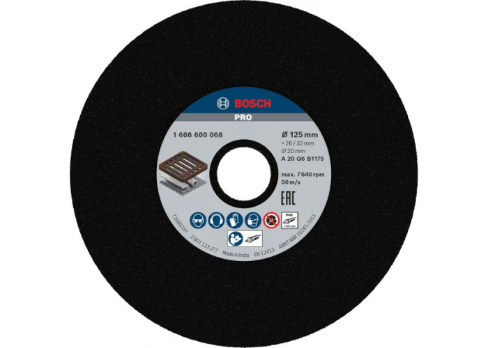 Bosch PRO Metal використовується для грубого шліфування заготовок зі сталі та чавуну. Встановлюється в прямі шліфувальні машини, має діаметр 125 мм з отвором для посадки 20 мм і зерном G20.