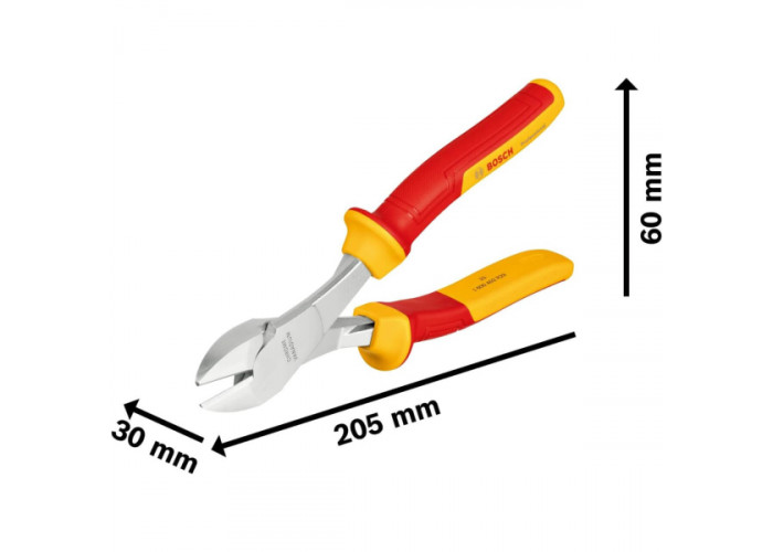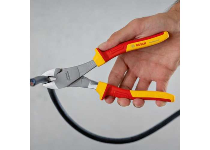 - Діагональні силові бокорізи з високим важелем Bosch Professional VDE 200 мм — це надійний і безпечний інструмент, розроблений спеціально для професійного застосування в електромонтажних роботах. Він добре тримається в руках і перекушує металеві предмети.