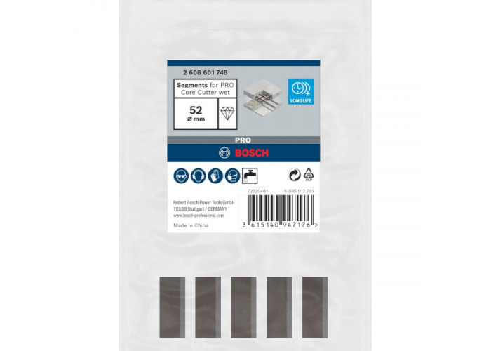 - Змінні алмазні сегменти Bosch PRO Core Cutter wet у кількості 5 штук з висотою 10 мм призначаються для встановлення на коронки діаметром 52 мм з кріпленням 1 1/4 UNC.