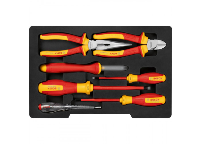 - Змішаний набір ізольованих ручних інструментів Bosch Professional VDE з 7 предметів — це універсальне і надійне рішення для фахівців, які працюють в умовах, де потрібна підвищена безпека при контакті з електрикою.