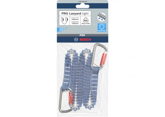 - Страховочный шнур Bosch PRO Lanyard light с двумя карабинами — это надежное решение для защиты инструмента от случайного падения при работе на высоте. Он разработан специально для обеспечения безопасности на строительных и монтажных площадках, где подобные ситуации могут привести не только к повреждению оборудования, но и к травмам.