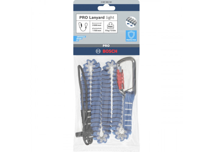 - Страховочный шнур Bosch PRO Lanyard light с карабином и петлей из круглого шнура — это надежное решение для защиты инструмента от случайного падения при работе на высоте. Он разработан специально для обеспечения безопасности на строительных и монтажных площадках, где подобные ситуации могут привести не только к повреждению оборудования, но и к травмам.