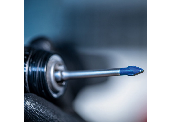 • Робочий наконечник має багатогранну структуру з несиметричними ріжучими площинами, які не просто ріжуть матеріал, а розподіляють навантаження між собою, знижуючи вібрацію і тиск на одну точку. Це робить свердління більш м'яким, контрольованим і швидким, особливо під час проходження верхнього, найгладкішого і твердого шару плитки.