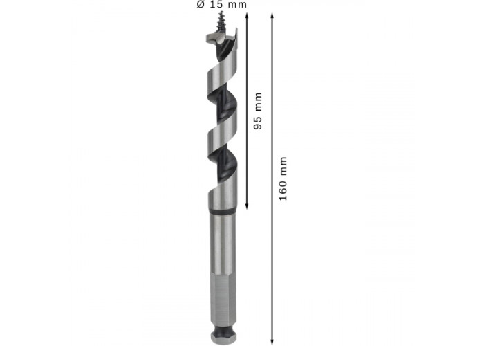 Професійне гвинтове свердло по дереву діаметром 15 мм із загальною довжиною 160 мм. Шестигранний хвостовик