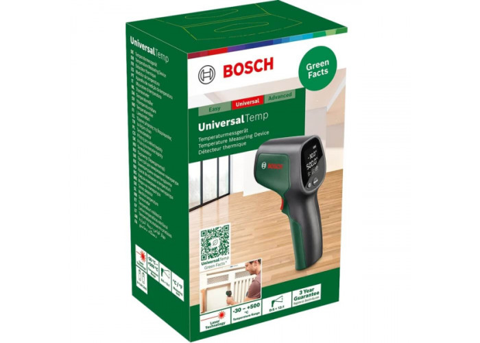 - Bosch UniversalTemp предназначен для каждодневного измерения температуры различных материалов в бытовых условиях. Быстро и точно обнаружит места утечки теплоносителей, измерит температуру еды, радиатора отопления, рядом с окном, в морозильной камере или у камина.