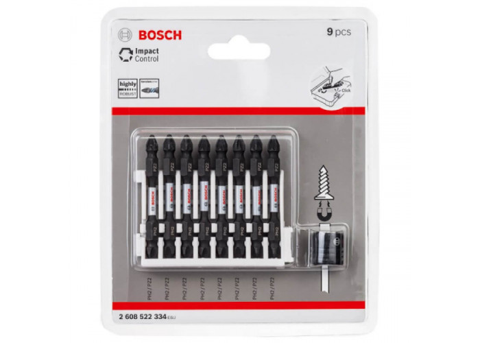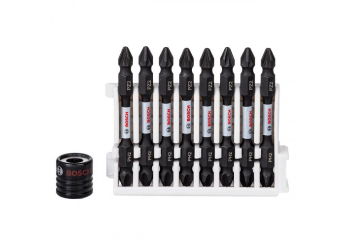 Ударные биты двусторонние PH2/PZ2 Bosch Impact Control — компактный набор из 8 насадок, длиной 65 мм. Работает с ударными инструментами, где стандартное крепление 1/4".