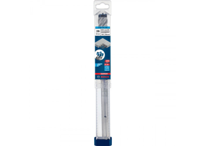 Ударный бур Bosch Expert SDS-Max-8X диаметром 26 мм имеет рабочую длину 200 мм (при общей – 320 мм). Подходит к перфораторам с патроном SDS-Max.