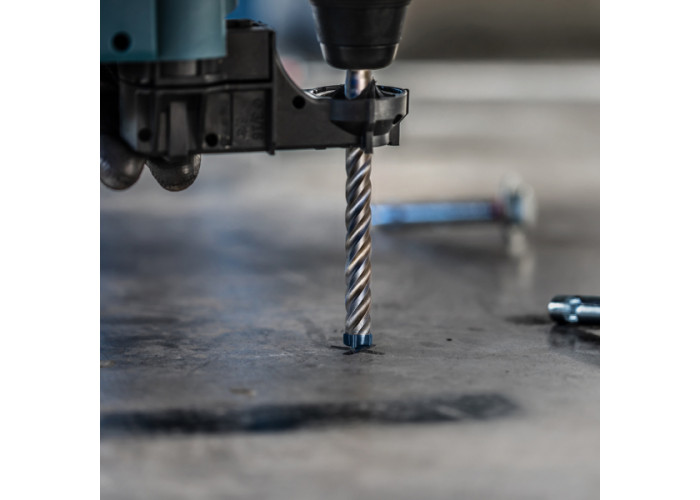 - Обладает полностью твердосплавной головкой, которая представляет собой усовершенствованную конструкцию с четырьмя режущими кромками. Эта головка изготовлена из прочного металла, и она не только не заедает, но и не ослабевает при сверлении с ударом. Это значительно повышает его долговечность и эффективность при работе с армированным бетоном.