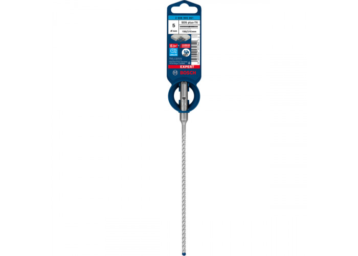 Ударный бур Bosch Expert SDS-plus-7X диаметром 5 мм имеет рабочую длину 150 мм (при общей – 215 мм). Подходит к перфораторам с патроном SDS-Plus.