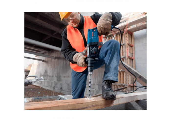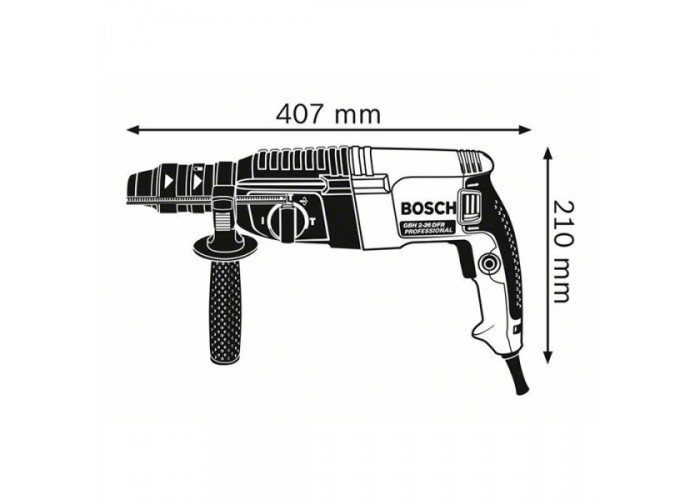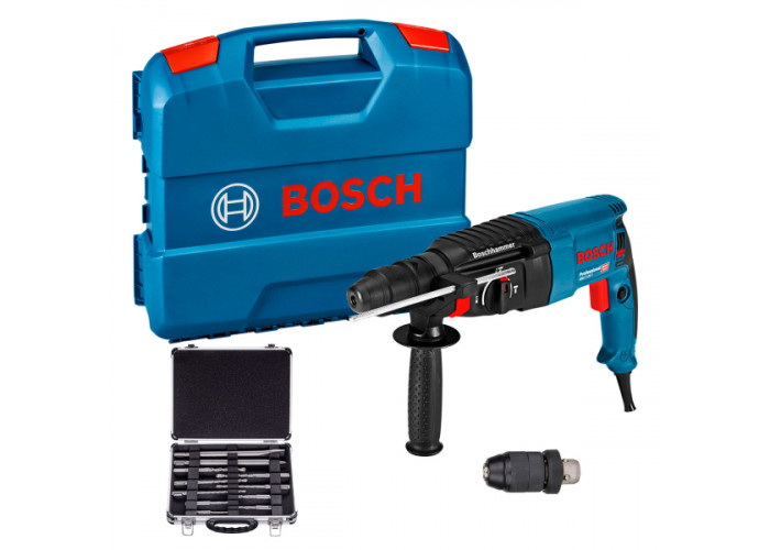 Трирежимний електроперфоратор Bosch GBH 2-26 DFR Professional (номер для замовлення 0611254768) з патроном SDS-plus призначений для свердління бетону з ударом, легкого довбання. Швидке та легке свердління досягається потужним двигуном 800 Вт і високою (як для 2-кілограмового класу перфоратора) силою удару 2,7 Дж. Здійснюючи від 0 до 4000 ударів за хвилину, перфорує та виконує легкі довбальні роботи в бетоні, цегляних кладках, камені. З частотою обертів 900 об/хв свердлить отвори в бетоні діаметром до 26 мм, деревині — 30 мм, металі — 13 мм, в цегляній кладці за допомогою різців —до 68 мм. Зі змінним швидкозатискним патроном 13 мм. Набір із 9 бурів та 2 зубил у подарунок!