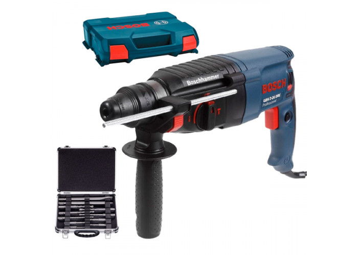 Трирежимний електроперфоратор Bosch GBH 2-26 DRE Professional (номер для замовлення 0611253708) з патроном SDS-plus призначений для свердління бетону з ударом, легкого довбання. Швидке і легке свердління досягається потужним двигуном 800 Вт і високою (як для 2-кілограмового класу перфоратора) силою удару 2,7 Дж. Здійснюючи від 0 до 4000 ударів в хвилину, перфорує і виконує легкі довбальні роботи в бетоні, цегляних кладках, камені. З частотою обертів 900 об/хв свердлить отвори в бетоні діаметром до 26 мм, деревині — 30 мм, металі —13 мм, в цегляній кладці за допомогою різців — до 68 мм. Доставляється в чемоданчику з додатковим набором із 9 SDS-Plus свердел та 2 зубил.
