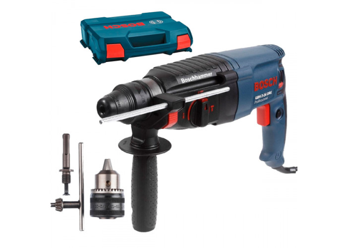 Трирежимний електроперфоратор Bosch GBH 2-26 DRE Professional (номер для замовлення 0611253708) з патроном SDS-plus виконує свердління з ударом бетону, цегляної кладки, каменю, легке довбання. Швидке проходження матеріалу досягається потужним двигуном 800 Вт і високою (як для 2-кілограмового класу перфораторів) силою удару 2,7 Дж від 0 до 4000 ударів. З частотою обертів 900 об/хв свердлить отвори в бетоні діаметром до 26 мм, деревині — 30 мм, металі —13 мм, в цегляній кладці за допомогою різців — до 68 мм. З зубчастим патроном з SDS-plus адаптером.