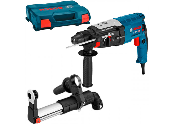 Трирежимний перфоратор Bosch GBH 2-28 потужністю 880 Вт з ударом силою 3,2 Дж призначений для перфорації бетону (28 мм буром), цегли (68 мм коронкою), каменю, легких довбальних робіт, свердління без удару деревини (30 мм), металу (13 мм), кераміки, пластмас, закручування та відкручування кріпильних елементів. Число оборотів (0-900 об/хв) і частота ударів (0-4000 об/хв) регулюються. Патрон SDS-Plus. Інструмент поставляється у пластиковій валізі з обмежувачем глибини, додатковою рукояткою. Додатково в комплектацію включена практична насадка для пиловидалення GDE 16 Plus.