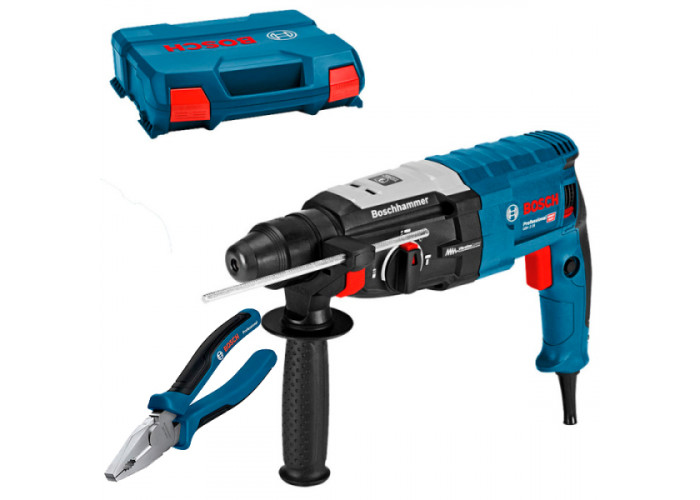 Трирежимний перфоратор Bosch GBH 2-28 потужністю 880 Вт з ударом силою 3,2 Дж призначений для перфорації бетону (28 мм буром), цегли (68 мм коронкою), каменю, легких довбальних робіт, свердління без удару деревини (30 мм), металу (13 мм), кераміки, пластмас, закручування та відкручування кріпильних елементів. Число оборотів (0-900 об/хв) і частота ударів (0-4000 об/хв) регулюються. Патрон SDS-Plus. Інструмент поставляється у пластиковій валізі з обмежувачем глибини, додатковою рукояткою, комбінованими плоскогубцями 180 мм.
