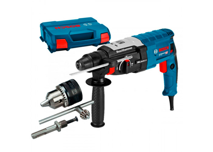 Трирежимний перфоратор Bosch GBH 2-28 потужністю 880 Вт з ударом силою 3,2 Дж призначений для перфорації бетону (28 мм буром), цегли (68 мм коронкою), каменю, легких довбальних робіт, свердління без удару деревини (30 мм), металу (13 мм), кераміки, пластмас, закручування та відкручування кріпильних елементів. Число оборотів (0-900 об/хв) і частота ударів (0-4000 об/хв) регулюються. Патрон SDS-Plus. Інструмент поставляється у пластиковій валізі з обмежувачем глибини, додатковою рукояткою. З зубчастим патроном та SDS-Plus адаптером.
