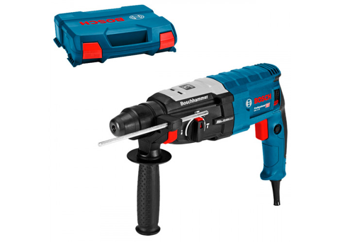 Трирежимний перфоратор Bosch GBH 2-28 потужністю 880 Вт з ударом силою 3,2 Дж призначений для перфорації бетону (28 мм буром), цегли (68 мм коронкою), каменю, легких довбальних робіт, свердління без удару деревини (30 мм), металу (13 мм), кераміки, пластмас, закручування та відкручування кріпильних елементів. Число оборотів (0-900 об/хв) і частота ударів (0-4000 об/хв) регулюються. Патрон SDS-Plus. Інструмент поставляється у пластиковій валізі з обмежувачем глибини, додатковою рукояткою.