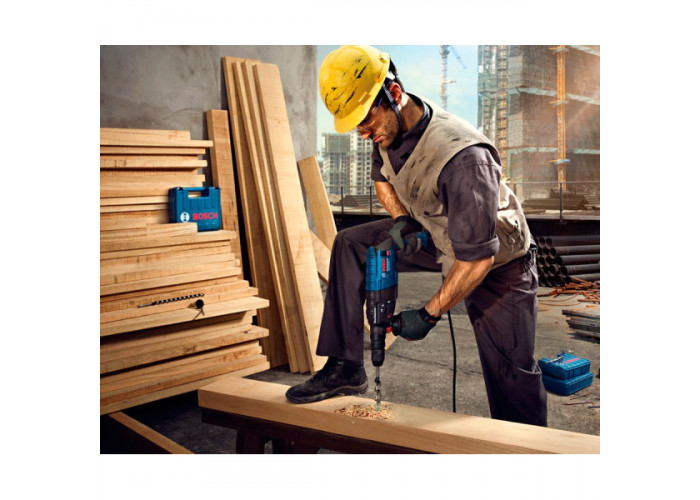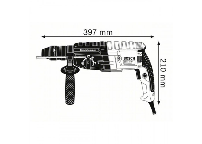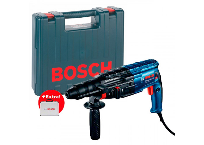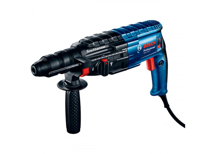 790 Вт перфоратор Бош GBH 240 F з високою швидкістю буріння, яка встановлюється (0-930 об/хв), і багаторазовим ударом (0-4200 уд/хв) енергією по 2,7 Дж кожен. Три режиму функціонування уможливлюють довбання, перфорування у бетоні отворів діаметром 24 мм, цеглі (коронкою 68 мм) і безударне свердління у дереві (30 мм), металі (13 мм). Два патрона SDS-Plus і швидкозатискний для простого переходу від одного виду робіт до інших. Блокування обертання в режимі з ударом. Реверс. Перфоратор поставляється у пластмасовій валізі з двома патронами, обмежувачем глибини, додатковою ручкою та набором із 9 бурів та 2 зубил.