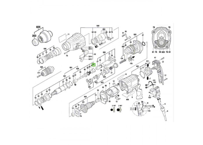 Змінний патрон; Обмежувач глибини (1613001010); Додаткова рукоятка (2602025141); Чемодан (2605438524); Набір 11 бурів та 2 зубила