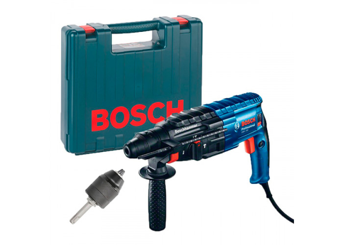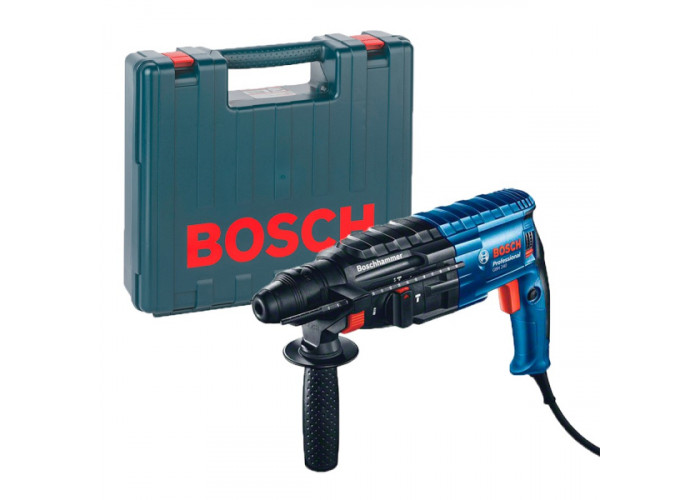 Перфоратор перфоратор BOSCH GBH 240 - новий стандарт роботи з бетоном. Передбачено 4 режими швидкостей. Працює як перфоратор, шуруповерт і дриль. Є реверс. Встановлено електромотор 790 W, енергія удару становить 2,7 Дж. Ударний механізм видає 0-4.200 уд / хв, частота обертань в хвилину 930. Робить перфорації в бетоні 2,4 см, в цеглі 6,8 см, в металі 1,3 см, в дереві 0,3 см. у комплектацію входить пластиковий кейс, обмежувач глибини і додаткова рукоять, а також швидкозатискний патрон Bosch SDS-Plus 1.5-13 мм.