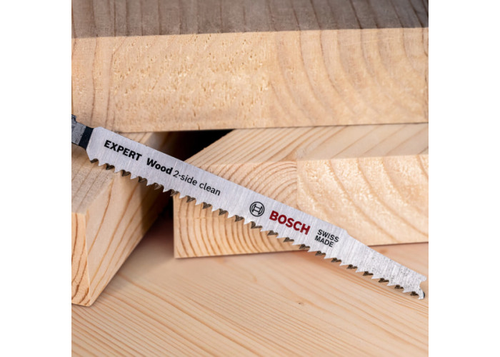 - Особливістю полотен Expert Wood 2-Side Clean є наявність двох рядів зубів, спрямованих протилежно один одному, що забезпечує ідеально рівний зріз без задирок з обох сторін матеріалу. Це особливо корисно під час роботи із заготовками, які складно перевертати, або під час використання лобзика в перевернутому положенні.