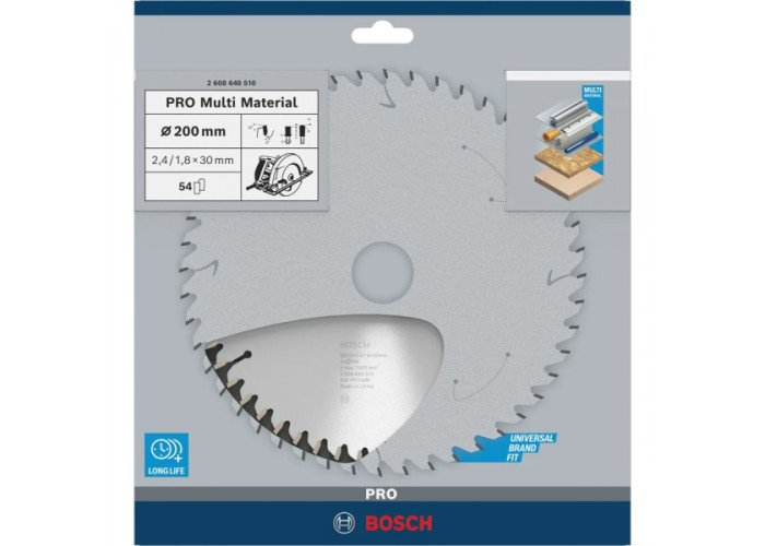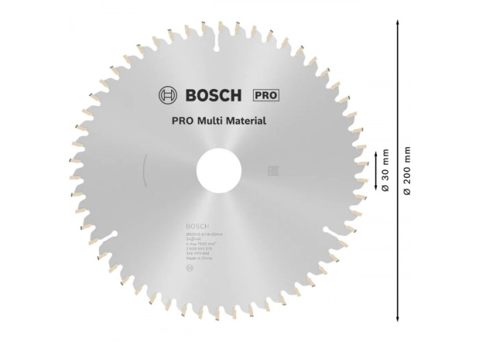Пиляльний диск Bosch PRO Multi Material товщиною 1,8 мм діаметром 200 мм з посадковим отвором 30 мм для циркулярок та торцювальних пил. 54 зуба з геометрією HTLCG з негативним переднім кутом дозволяють виконувати тонкі (2,4 мм), точні, без сколів пропили у пластмасі, кольорових металах, склопластику, ДВП, паркетних та ламінатних дошках, епоксидних матеріалах.