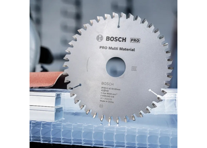 - Диск Bosch PRO Multi Material — ідеальний круг для дрібного ремонту, внутрішньої обробки. Він виконує чудові пропили з охайними, без сколів, крайками шириною 2,4 мм у різних матеріалах: пластмасі, кольорових металах, деревині, паркеті, ламінаті, епоксидних, щитових матеріалах.
