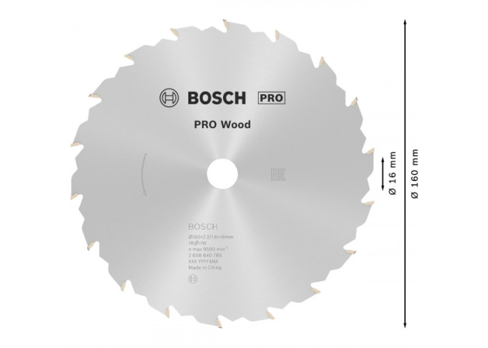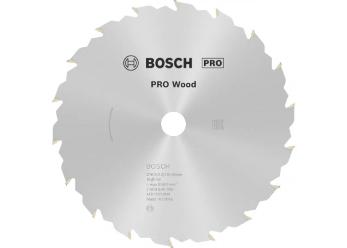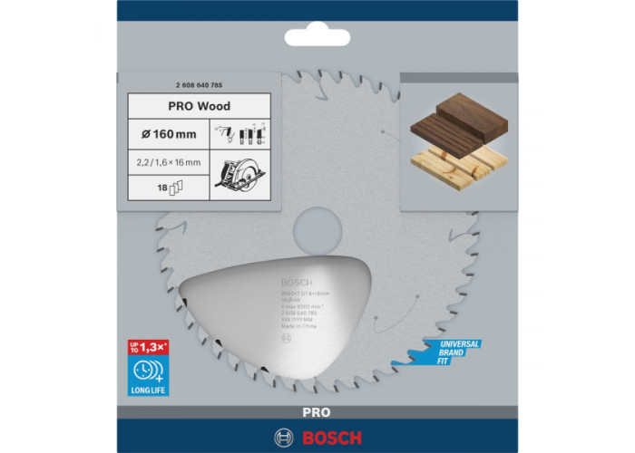 - Циркулярний круг Bosch PRO Wood діаметром 160 мм, з посадковим отвором 16 мм, з 18 зубами форми FZ/WZ здійснює швидкі, грубі різи шириною 2,4 мм уздовж та поперек волокон деревини будь-яких порід, необроблених ДСП, фанері, вагонке, столярних плитах, а також точні кутові пропили.