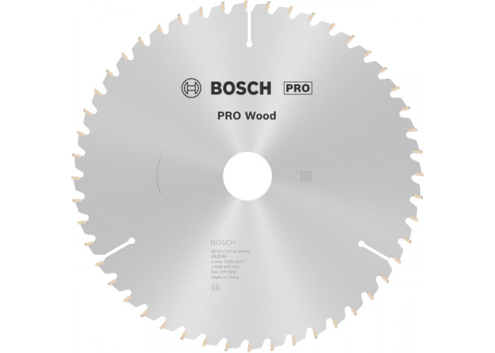 Твердосплавний пиляльний диск Bosch PRO Wood товщиною 1,4 мм, діаметром 216 мм з посадкою 30 мм з 48 зубами виконує пропив товщиною 2 мм у деревині будь-якої твердості. Форма зуба ATB.