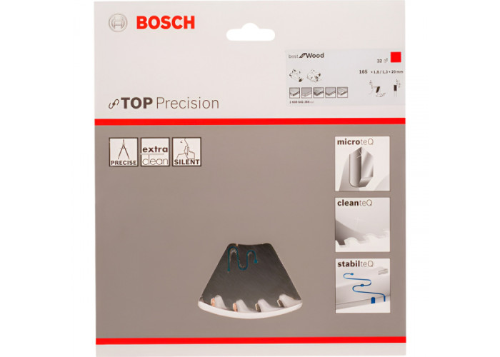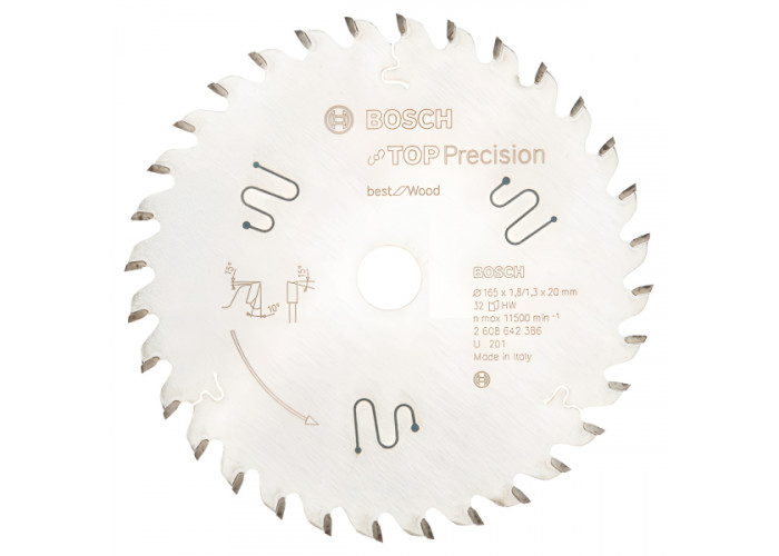 • Bosch Bosch Top Precision Best for Wood 165х20х1.8 мм, 32Т - високоякісний інструмент, призначений для чистого і точного різу деревини (тверді та м'які породи, ДСП, фанера).