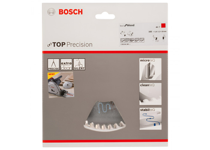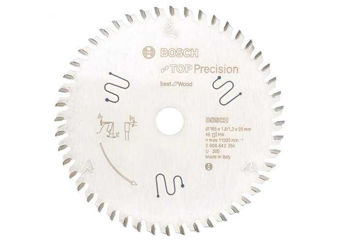 - Bosch Top Precision Best for Wood 165х20х1.8 мм, 48Т - високоякісний інструмент, призначений для чистого і точного різу деревини (деревина будь-яких порід, ДСП, МДФ, фанера), металу (кольорові метали, алюміній, сталь) і пластику (ПВХ, полікарбонат, оргскло).
