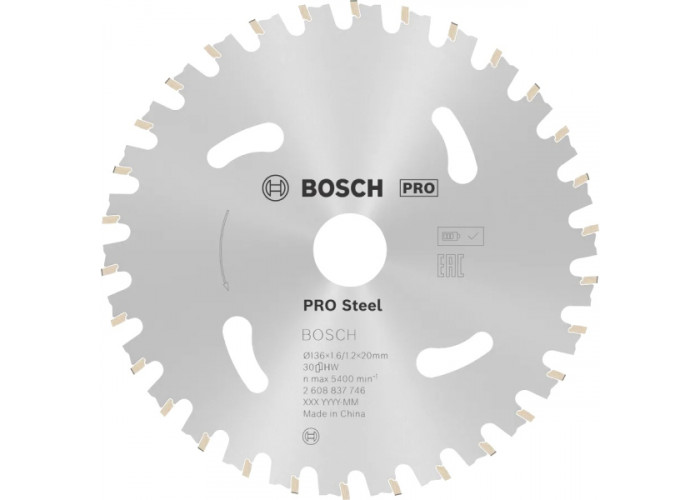 Пиляльний диск Bosch PRO Steel діаметром 136 мм з посадкою 20 мм призначений для виконання робіт по металах і сталі та застосовується з акумуляторними циркулярними пилами. Максимальна швидкість обертання становить 5400 об/хв. 30 зубів форми HB.