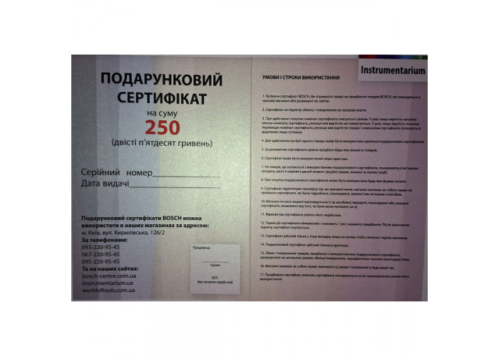 Подарочный сертификат 250 грн на покупку продукции Bosch в интернет-магазине Instrumentarium и всей сети наших фирменных магазинов Bosch.