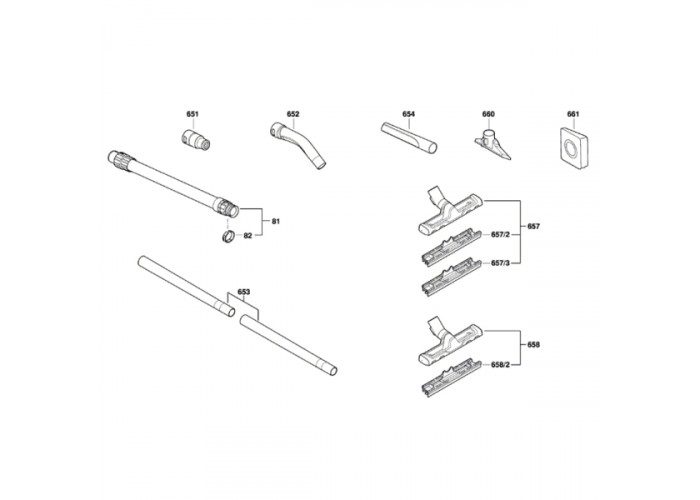 Насадка для сухого очищення; Вкладиші щітки і гумовою кромки; Щілинна насадка; 2 пиловідвідні трубки, 0,5 м, Ø 35 мм; Перехідник для пиловідведення; Шланг 2,2 м, 35 мм, антистатичний; Рукоятка; Паперовий мішок для збору пилу; Фільтр (2 шт); багаторазовий мішок
