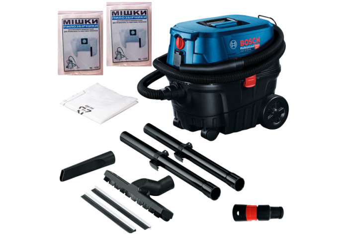 Пилосос Bosch GAS 12-25 PS; HEPA фільтр (1619PB3282); Фільтр попереднього очищення (1619PB3283); Антистатична трубка (1619PA7324); Щілинна насадка; Шланг, 3 м (1619PA7322); Мішок Instrumentarium для пилососів Bosch Gas 12-25 (bsGas1225)
