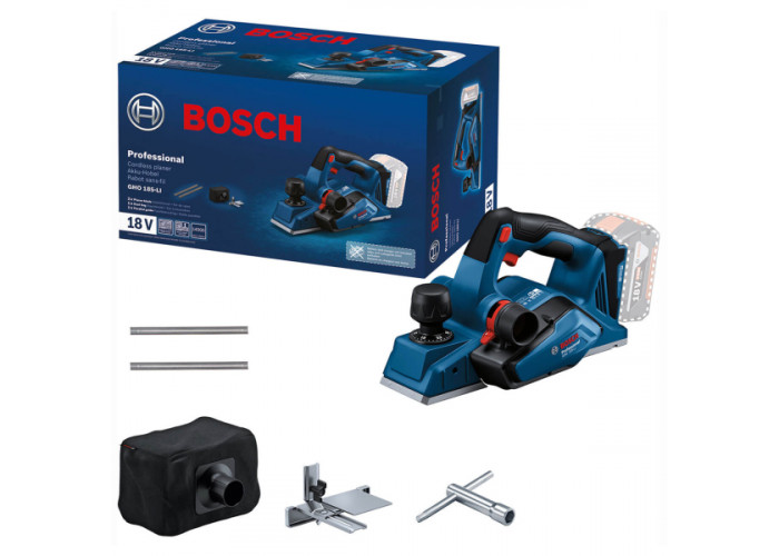 Рубанок Bosch Professional GHO 185-LI працює від 18-вольтового літій-іонного акумулятора. Має регулювання глибини обробки до 2.6 мм. Ширина стругання 82 мм. Здатність вибірки чверті глибиною 0-9 мм. Число обертів 14000 об/хв. Вибір напрямку викиду стружки. Вага — 2.4 кг (без акумулятора). Поставляється з мішком для збору пилу, направляючою скобою, ключем для збірки.