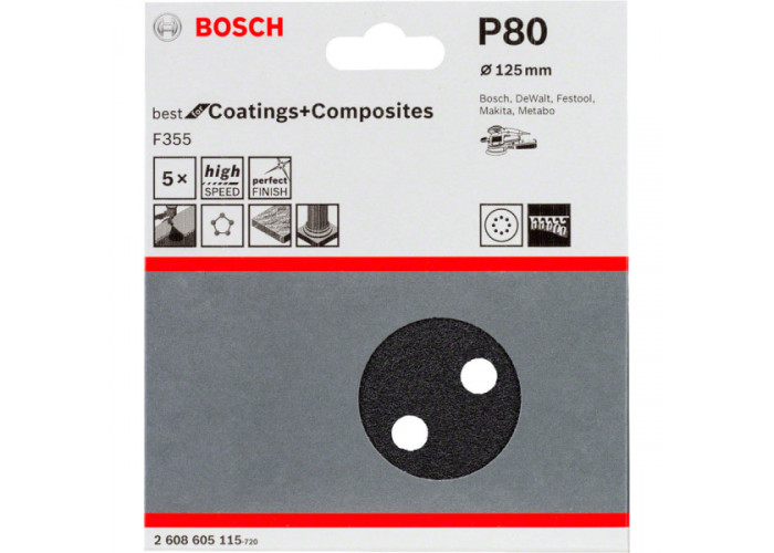 Опис шліфувального листа Bosch F355 Best for Coatings and Composites 125 мм, зерно 80, 5 шт:
