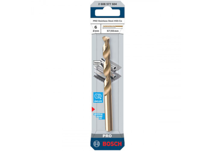 • Спіральне свердло Bosch PRO Stainless Steel HSS-Co діаметром 6,0 мм призначене для точного та надійного свердління широкого спектру матеріалів, включаючи конструкційну та нержавіючу сталь, кольорові метали, пластик та деревину.