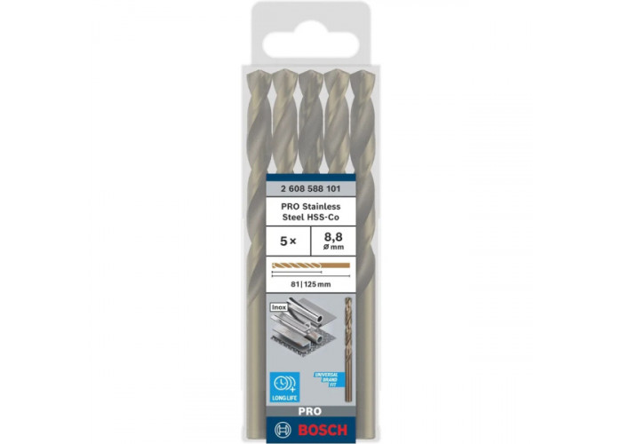- Спіральне свердло Bosch PRO Stainless Steel HSS-Co створене для точного та довговічного свердління нержавіючої сталі та інших твердих металів, де звичайний інструмент швидко втрачає ефективність. Ця модель орієнтована на професійне застосування і підходить для завдань, що вимагають стабільного результату, високої зносостійкості та акуратного формування отворів без зміщення.