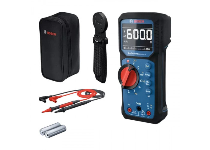Bosch Professional GDM 600-15 – точний мультиметр з розширеним функціоналом для вимірювання змінного струму 600 А і напруги до 600 В. Має ступінь захисту IP65. Живиться від двох акумуляторів 1,5 В LR6 (AA).