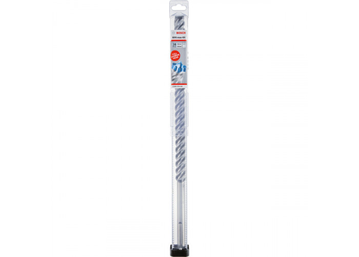- Бур Bosch SDS-Max-8X толщиной 28 мм, длиной 520 мм, 400 мм из которых приходятся на рабочую часть, имеет цельный центрирующий наконечник с 4 режущими кромками. Угол заточки наконечника 90 градусов. Твердосплавный наконечник и стальная основа бура соединены с помощью сварки.