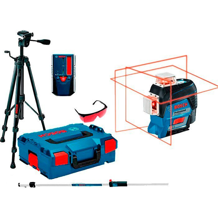 - Многие модели оснащены автоматической регулировкой. Более дорогие уровни Bosh обеспечивают круговую проекцию в 2-х – 3-х плоскостях. Прибор может комплектоваться держателем, штативом и специальными очками, улучшающими видимость лазерного луча.
